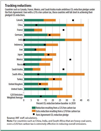 Can we calculate the price which would start to reduce some of these environmental externalities? Yes. The price of carbon does vary widely from country to country, scheme to scheme. However, the IMF calculates the global average price as only $2/tonne CO2. Where should it be? Much higher, according to the following organisations: the High-Level Commission on Carbon Prices suggested at least $50–100/tCO2 by 2030, an OECD report suggested $120, while the 2018 Intergovernmental Panel on Climate Change estimated that an effective tax would need to be at least $135. That is just 2030; BP suggests the 2050 price could be $250 on some scenarios. Of course, the ‘correct’ figure will vary from country to country. The tables below show a series of calculations by the IMF on the impact of different carbon prices on various major economies.