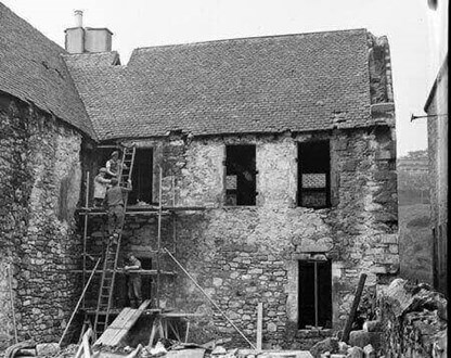 Prior to the 1950s restoration, the courtyard, or the current terrace, was roofed over and there was a solid staircase to serve the upper floors which was subsequently removed when the courtyard was reopened, and the roof removed. The photographic evidence from the 1920s shows that the stonework was once harled and there was a door in the West elevation, although, the stair up to it has gone by this point. In the 1950s, the harling was removed, the staircase door opening on the first floor was bricked up to create a window, the East chimney was demolished and the two doorways in the corner of the second floor were closed up. The ceiling level was lowered, and the main wing’s floor structure was removed and replaced along with the basement walls were rebuilt using brick. The original main entrance to Panmure was turned into a window and a new entrance was routed to the courtyard.