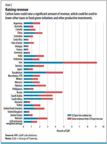 Can we calculate the price which would start to reduce some of these environmental externalities? Yes. The price of carbon does vary widely from country to country, scheme to scheme. However, the IMF calculates the global average price as only $2/tonne CO2. Where should it be? Much higher, according to the following organisations: the High-Level Commission on Carbon Prices suggested at least $50–100/tCO2 by 2030, an OECD report suggested $120, while the 2018 Intergovernmental Panel on Climate Change estimated that an effective tax would need to be at least $135. That is just 2030; BP suggests the 2050 price could be $250 on some scenarios. Of course, the ‘correct’ figure will vary from country to country. The tables below show a series of calculations by the IMF on the impact of different carbon prices on various major economies.